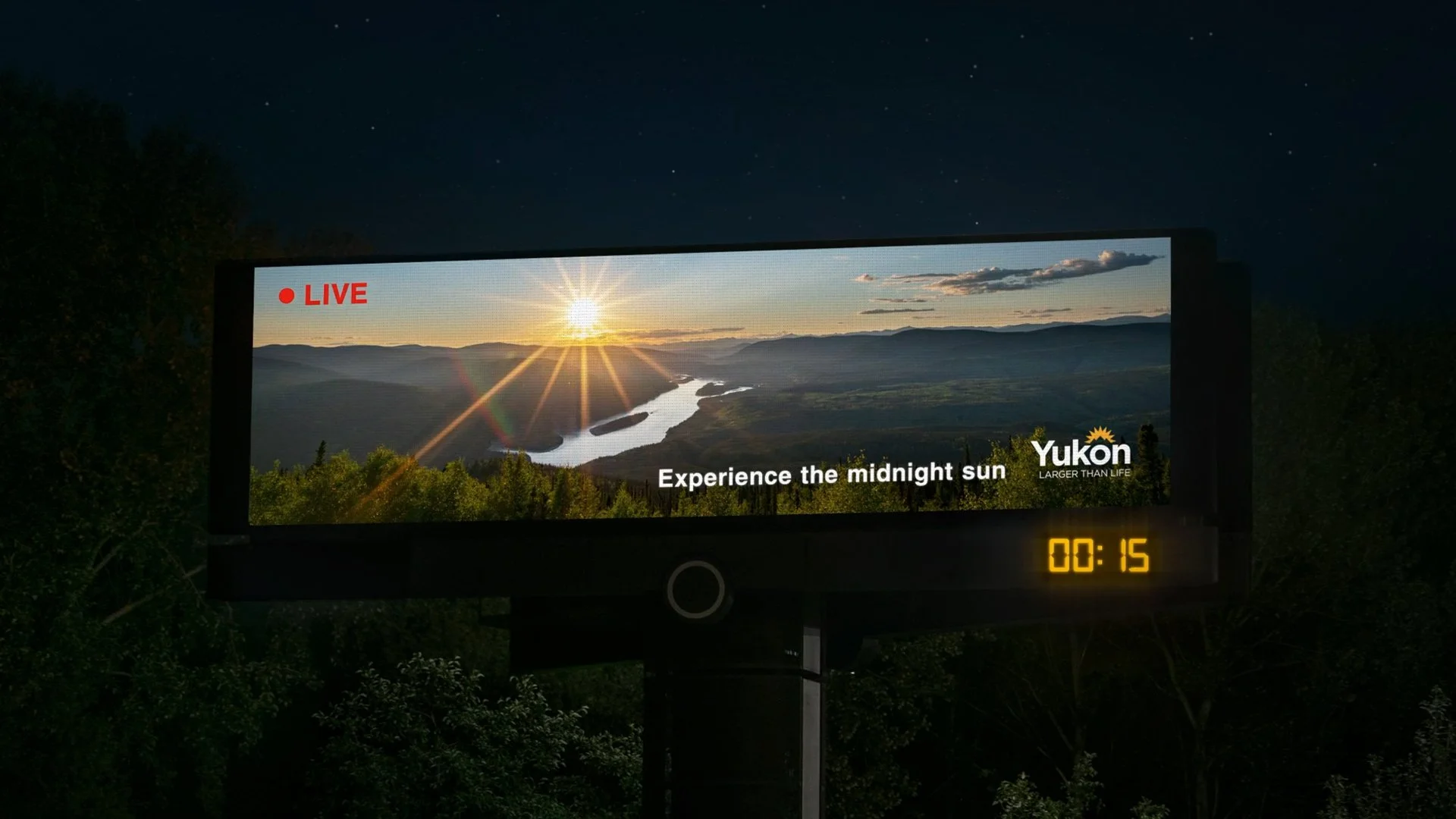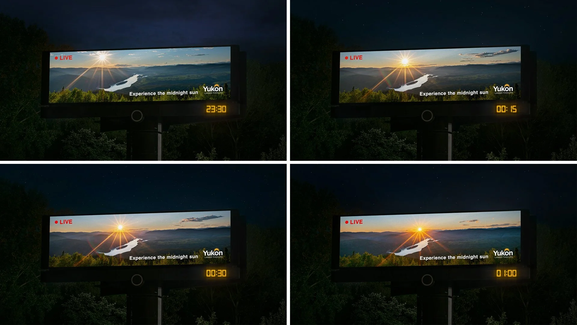 The midnight sun is a natural phenomenon around the Arctic Circle, where the sun never fully sets. To bring some of this magic to Vancouver, we streamed images of Yukon’s midnight sun during its brightest two weeks, from 10:30 pm to 1:30 am, live on digital billboards across the city, lighting up the night sky.